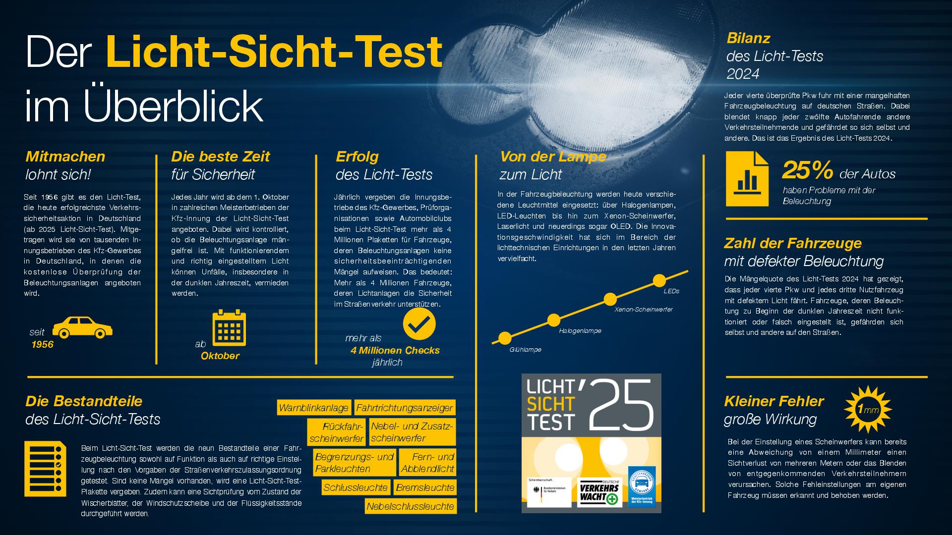 Jedes Jahr in der Zeit vom 1. bis 31. Oktober können motorisierte Fahrzeuge im Rahmen der bundesweiten Verkehrssicherheitsaktion „Licht-Sicht-Test“ der „Deutschen Verkehrswacht“ in Innungsbetrieben des Kfz-Gewerbes zum Licht-Sicht-Test vorgestellt werden.