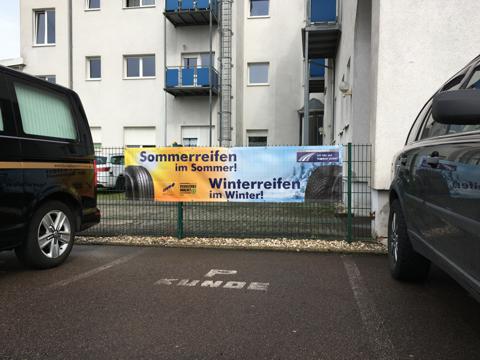 Das Banner auf dem Kundenparkplatz vom Autohaus Huttenstrasse GmbH weist auf die Reifenwechselaktion: