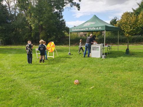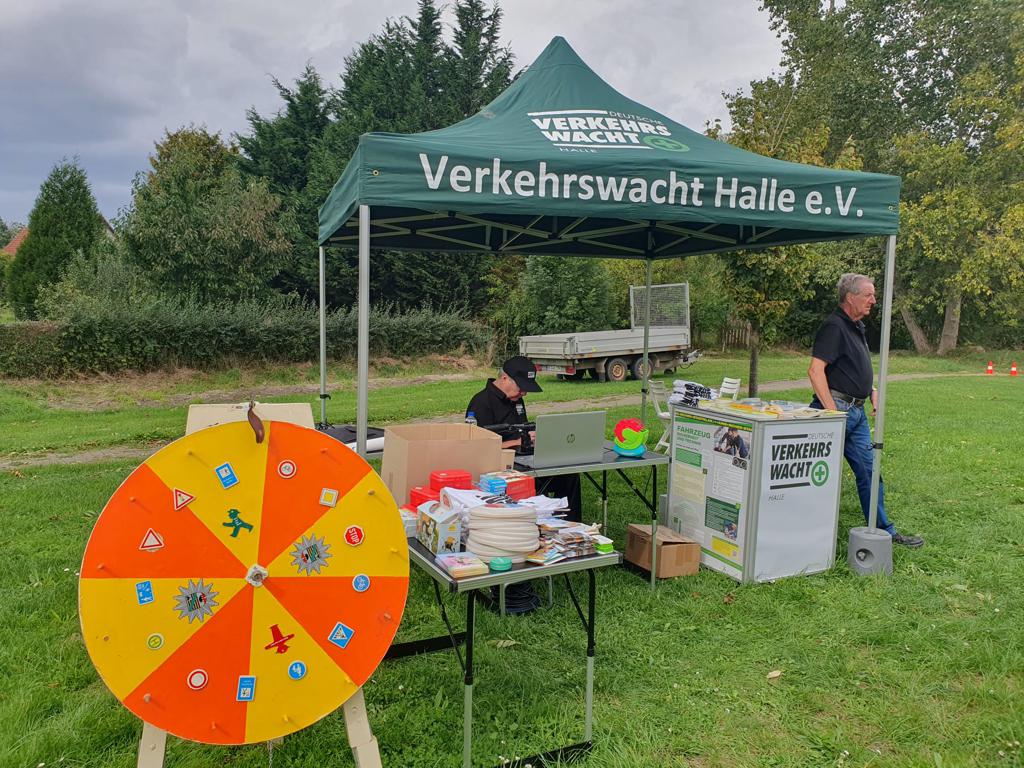 Auch in diesem Jahr wurde in Brachwitz, einem Ortsteil von Wettin-Löbejün, zu einem Familienfest am 13. September 2025 eingeladen. Für die Unterhaltung der zahlreichen Gäste sorgten neben verschiedenen Vereinen und Unternehmen aus dem idyllisch gelegenen Ort auch die Verkehrswacht Halle e. V. An ihrem Stand gab es neben Informationen und Gesprächsangeboten rund um das Thema Verkehrssicherheit vor allem spannende Angebote für Kinder und Jugendliche. Während die Jüngsten ihre Fahrkünste ganz praktisch entlang eines Parcours – selbstverständlich ordnungsgemäß ausgerüstet mit Sicherheitsweste und Helm – auf einem Kinderrad erproben konnten, testeten ältere Kinder, Eltern und Großeltern ihr Reaktionsvermögen an einem Fahrrad-Bremssimulator. Gut informiert zeigten sich vor allem die Vor- und Grundschulkinder beim Erkennen der Verkehrszeichen am Glücksrad. Da staunten manchmal selbst die Eltern und Großeltern nicht schlecht.